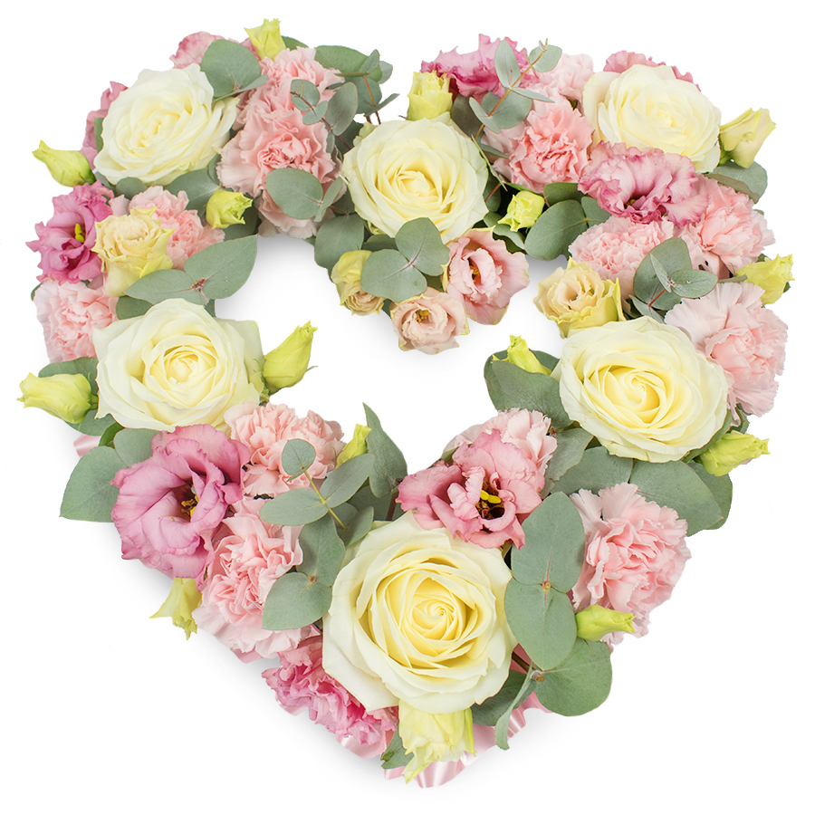 Our Graceful Open Heart Bouquet is a beautiful expression of love and remembrance. This sophisticated arrangement showcases white roses, pink carnations, pink lisianthus, and eucalyptus leaves, elegantly combined to create a stunning visual tribute.